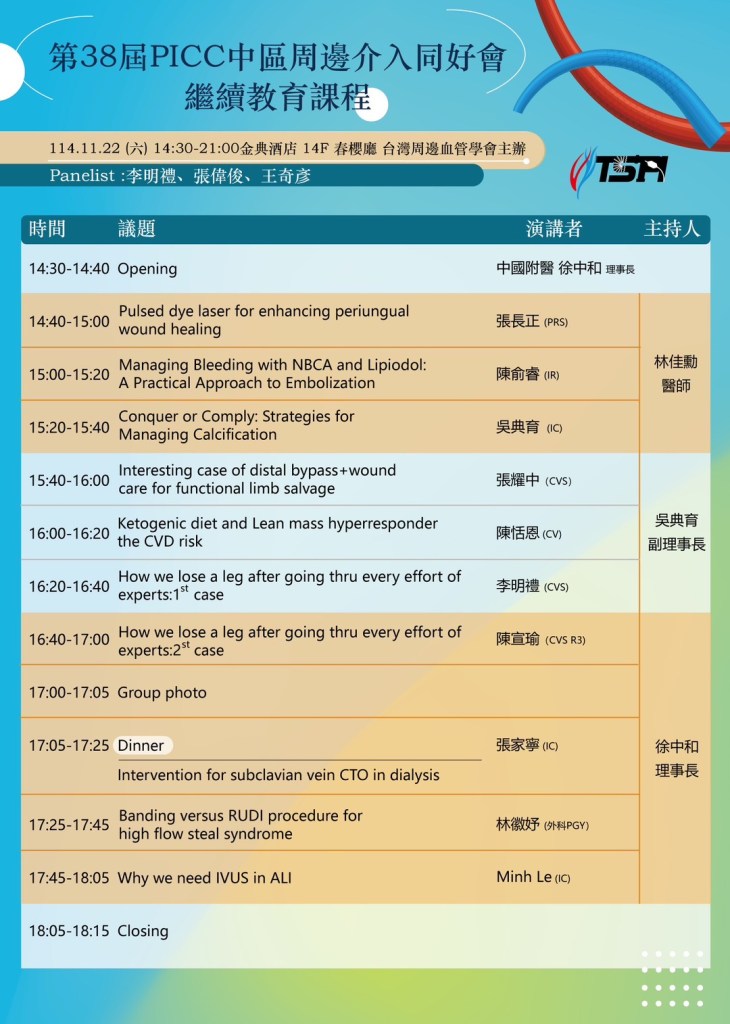 本次課程由 台灣周邊血管學會 TSPI主辦,邀請多位重量級講師,從傷口治療、栓塞策略、鈣化處理、Bypass 與 Limb salvage、到 AVF / 高流量處理、IVUS、Dialysis Intervention……